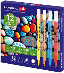 Набор акриловых маркеров с круглой формой корпуса из пластика. В комплекте 12 ярких цветов. Толщина линии письма – 0,7-1 мм. Объем краски – 3 мл. Пигментированная акриловая краска на водной основе практически не имеет запаха, после высыхания обладает повышенной светостойкостью и водостойкостью.