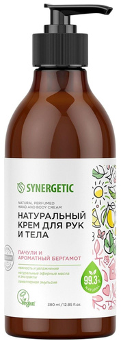 Крем для рук и тела Synergetic Пачули и ароматный бергамот 380 мл<br><br>Обеспечивает интенсивное питание и дарит коже нежность и ощущение комфорта. Активные компоненты крема в сочетании с изомератом сахарида обеспечивают сохранение влаги в коже, обладают регенерирующим действием и восстанавливают барьерные функции кожи. Экстракты бергамота и вербены лекарственной поддерживают гидролипидный баланс, а масла ши и жожоба защищают от внешних вредных воздействий. Натуральные масла кокоса и сладкого миндаля эффективно увлажняют, смягчают и ухаживают за кожей, делая её идеально гладкой и бархатистой. Комплекс натуральных пребиотиков галакто-,манно- и олигосахаридов нормализует и сохраняет естественный микробиом кожи. Парфюмерная композиция с натуральными эфирными маслами кедра, пачули и гваякового дерева оставляют на коже приятный аромат. Натуральный крем дерматологически протестирован независимым институтом в Германии. Он не содержит силиконов, парабенов, минеральных масел, красителей, компонентов животного происхождения, не тестируется на животных и сертифицирован британской организацией The Vegan Society. Знак Vegan — мировой стандарт этичной продукции.<br><br>Способ применения: нанести массирующими движениями на чистую сухую кожу.<br><br>Состав: Aqua, Glycerin (растительный увлажнитель), Caprylic/Capric Triglyceride (смягчающий кожу эмолент на основе пальмового и кокосового масел), Butyrospermum Parkii Butter (масло карите), Cetearyl Alcohol (натуральный эмульгатор), Glyceryl Stearate (натуральный эмульгатор), Potassium Cetyl Phosphate (увлажняющий эмульгатор, структурообразователь), Behenyl Alcohol (натуральный загуститель), Stearic Acid, Palmitic Acid (натуральный эмульгатор, смягчающий компонент), Verbena Officinalis Leaf Extract (экстракт вербены), Citrus Aurantium Bergamia Fruit Extract (экстракт бергамота), Hydrolyzed Caesalpinia Spinosa Gum, Caesalpinia Spinosa Gum (галакто-, манно-, олигосахариды, пребиотики), Simmondsia Chinensis Seed Oil (масло жожоба), Cocos Nucifera Oil (масло кокоса), Sweet Almond Oil Polyglyceryl-4 Esters (водорастворимое масло миндаля), Saccharide Isomerate (увлажняющий актив), Undecane, Tridecane (натуральный эмолент), Sorbitan Caprylate (натуральный эмульгатор), Propanediol (увлажняющий компонент), Benzoic Acid (природный консервант), Polyglyceryl-10 Laurate (натуральный стабилизатор эмульсий), Xanthan Gum (ксантановая камедь), Parfum (отдушка), Potassium Hydroxide (регулятор кислотности), Sodium Benzoate, Potassium Sorbate (природные консерванты), Citric Acid, Sodium Citrate, Limonene, Linalool, Citral, Citronellol (ароматические вещества, компоненты отдушки).