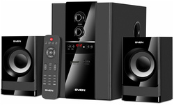 Колонки SVEN MS-1821 оснащены встроенным FM-тюнером, который позволит в два счета переключиться на прослушивание радиостанций. Одним из плюсов акустики стало наличие в комплекте поставки беспроводного пульта дистанционного управления, который позволит настроить параметры работы без необходимости подходить к системе. К телевизору или любому другому источнику звука колонки подключаются посредством разъемов RCA, также предусмотрена возможность беспроводного подключения при помощи технологии Bluetooth.