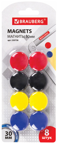 Диаметр магнита составляет 30 мм. Разноцветные магниты помогут надежно прикрепить листы бумаги к магнитно-маркерной поверхности досок, витрин и флипчартов. Надежно удерживаются на любой железной или стальной поверхности. Поставляются в удобной блистерной упаковке с европодвесом.