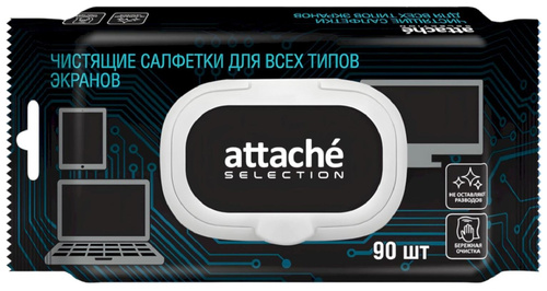 <b>Салфетки влажные Attache Selection для экранов (90 штук в упаковке).</b><BR>Влажные чистящие салфетки Attache Selection в мягкой упаковке изготовлены из крепированной бумаги. Подходят для экранов и мониторов всех типов, зеркал и стеклянных поверхностей. Обеспечивают деликатный и эффективный уход, очищают от пыли, загрязнений и отпечатков пальцев. Не оставляют разводов, не содержат абразивных веществ. Удобны в поездках. Пластиковый защитный клапан надежно предохраняет салфетки от высыхания. После размораживания сохраняют свои потребительские свойства. <BR>В упаковке 90 штук, размер одной салфетки 15×18 см. <BR>Произведены в России.<BR><b>Меры предосторожности:</b> Перед применением ознакомьтесь с инструкцией производителя устройства. Используйте с осторожностью на мониторах с антибликовым и антистатическим покрытием. После распаковки следует вытягивать салфетки из центра для вставки в крышку.<BR><b>Срок годности:</b> 3 года.<BR><b>Рекомендуем протирать сухой салфеткой после влажной салфетки во избежание разводов.</b><br><br>Допускается замораживание салфеток в упаковке производителя, после размораживания салфетки сохраняют свои потребительские свойства.