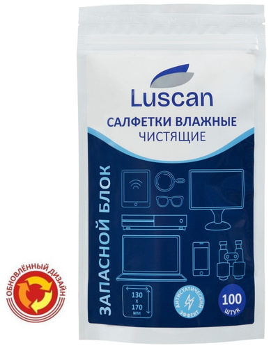 <b>Салфетки влажные для экранов Luscan сменный блок для туб (100 штук в упаковке)</b><BR><br>Запасной блок к влажным салфеткам Luscan . Салфетки предназначены для чистки экранов мониторов, в том числе жидкокристаллических, различной оптики, рабочих зон сканеров и копиров и других стеклянных поверхностей. Изготовлены из крепированной бумаги — более прочной и мягкой, чем обычная. Салфетки пропитаны специальным составом, подходящим для очистки оптических поверхностей техники. Салфетки безупречно очищают поверхности от пыли, грязи и отпечатков пальцев. Не оставляют разводов и ворсинок на экранах, не содержат спирта и не вызывают аллергию. Салфетки обладают антистатическим эффектом, препятствуя пыли меньше оседать на экраны.<BR>Салфетки имеют достаточно большой размер — 130×170 мм, что достаточно для очистки одного монитора. В упаковке 100 салфеток.<BR>Данная упаковка подходит для людей не привыкших переплачивать за упаковку. <BR>Подходят для использования в любых тубах (основной товар — артикул 127661).<BR><b>Рекомендуем протирать сухой салфеткой после влажной салфетки во избежание разводов.</b> <br><br>С осторожностью использовать на ноутбуках и смартфонах Apple, так как многие их экраны имеют антибликовое покрытие. Перед очисткой всего экрана желательно провести тест на не большом участке экрана ноутбука или смартфона.