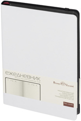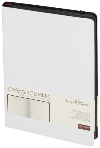 Ежедневник недатированный Bruno Visconti Megapolis Soft с белой обложкой из искусственной кожи в универсальном формате A5 (144×212 мм). Он сочетает стильный контраст белого и чёрного цветов, где чёрная резинка и цветной обрез блокируют его в закрытом виде, добавляя элегантности. Закруглённые углы обложки и блока гармонично сочетаются, придавая ему современный и утончённый вид. Ежедневник содержит 136 страниц тонированной офсетной бумаги плотностью 90 г/кв.м с линейкой, подходящей для записи и заметок. <br><br>Листы могут быть использованы с любого дня, так как в них предусмотрено поле для указания даты. На 18 страницах размещена справочная информация, охватывающая широкий спектр данных, включая часовые пояса, телефонные коды, религиозные праздники, единицы измерения, термины международной торговли, распад алкоголя в крови и многие другие полезные сведения. Под обложкой расположен конверт для бумаг и визиток, что делает этот ежедневник удобным для хранения важных документов. Он упакован в картонную подарочную коробку и подходит для персонализации, включая нанесение логотипа на обложку.