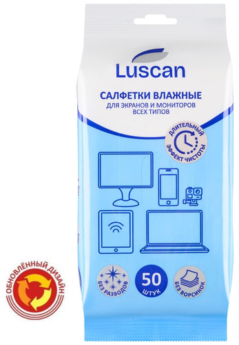 <b>Салфетки влажные для экранов Luscan с антистатическим эффектом (50 штук в пакете с клеевым клапаном)</b> <br><br>Влажные салфетки Luscan изготовлены из нетканого полотна. Подходят для экранов и мониторов — идеальное решение для ухода за монитором ноутбука, а также за любыми LCD/<nobr>TFT-экранами</nobr>, плазменными панелями, сканерами. Их можно использовать для удаления грязи и пыли с различных стеклянных поверхностей. Влажные чистящие салфетки Luscan в мягкой упаковке обеспечивают деликатный и эффективный уход. Они не оставляют разводов, устраняют статическое электричество и не содержат абразивных веществ. В упаковке 50 штук. Размер одной салфетки: 15×18 см. Рекомендуем протирать сухой салфеткой после влажной салфетки во избежание разводов.<BR><b>Состав:</b> нетканое полотно, пропитывающий лосьон.<BR> Состав пропитывающего лосьона: вода деминерализованная, изопропанол (более 5, но менее 15 %), композиция неионогенных ПАВ (менее 5 %), консервант (менее 5 %), отдушка (менее 5 %).<br><br>Допускается замораживание салфеток в упаковке производителя, после размораживания салфетки сохраняют свои потребительские свойства.