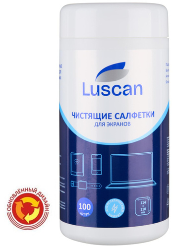 <b>Салфетки влажные для экранов Luscan с антистатическим эффектом 11.2×11 см (100 штук в тубе)</b> <br><br>Влажные салфетки Luscan изготовлены из нетканого материала повышенной плотности на основе полипропилена, предназначены для очистки LCD и TFT экранов мониторов, телевизоров, плазменных панелей, ноутбуков, стеклянных поверхностей сканеров, копиров и других устройств. Не оставляют разводов и ворса, обладают длительным антистатическим эффектом. Специальный состав с активными компонентами пролонгированного действия безупречно очищает поверхности от пыли и грязи, безопасен для кожи рук. Удобная туба-диспенсер с большой крышкой-дозатором препятствует высыханию салфеток. Материал повышенной плотности (18 г/кв.м) более эффективно очищает поверхность, исключает вероятность обрыва салфеток при вытаскивании.<br>Состав: вода более 30%, нПАВ менее 5%, консервант менее 5%, антистатический компонент менее 5%, отдушка менее 5%. <br>Размер одной салфетки: 112×110 мм. <br>В тубе 100 штук. <br>После распаковки следует вытягивать салфетки из центра для вставки в крышку. Рекомендуем протирать сухой салфеткой после, во избежание разводов. <br><br>Возможны поставки с разным типом салфеток из крепированной бумаги или мельтбауна без возможности выбора. <br><br>С осторожностью использовать на ноутбуках и смартфонах Apple, так как многие их экраны имеют антибликовое покрытие. Перед очисткой всего экрана желательно провести тест на не большом участке экрана ноутбука или смартфона.