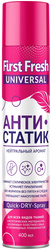 Антистатик First Fresh 400 мл<br><br>Антистатик First Fresh предназначен для снятия статического электричества и предотвращения его накопления на синтетических тканях, пластмассовых изделиях, коврах, полимерных и ковровых покрытиях и т.д. Уменьшает накопление пыли. Устраняет слипание тканей, искрение и треск. Безвредно для любых типов тканей. Легко снимает шерсть домашних животных с любых поверхностей при помощи щётки. Антистатик снимает статическое электричество с волос при обработке гребня или щётки перед расчёсыванием. <br>Способ применения: баллон встряхнуть в течение 3-5 секунд, с расстояния 20-25 см равномерно нанести средство на ткань до лёгкого увлажнения.<br>Меры предосторожности: использовать только по назначению! Опасно! Чрезвычайно легковоспламеняющийся аэрозоль! Беречь от источников воспламенения, нагревания, искр и открытого огня! Не распылять вблизи открытого огня или других источников воспламенения! Не курить во время использования! Беречь от солнечных лучей, избегать нагревания выше +50C! Баллон под давлением! Не нарушать целостность упаковки и не сжигать, даже после использования! Избегать попадания на чувствительную и повреждённую кожу! Не допускать попадания в глаза! При попадании в глаза немедленно промыть их большим количеством воды. При необходимость обратиться к врачу! Не вдыхать! Не глотать! Беречь от детей! Хранить отдельно от лекарств и пищевых продуктов, в сухом месте, вне доступа детей и домашних животных.<br>Состав: растворитель (более 30%), пропан/бутан/изобутан (более 30%), катионные ПАВ (менее 5%), парфюмерная композиция (менее 5%). Не содержит озоноразрушающих веществ.
