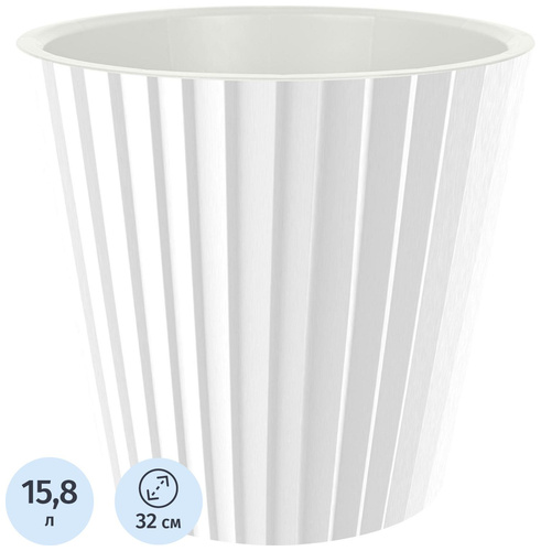 Горшок для цветов InGreen Sand 15.8 л с внутренней вставкой 14 л белый (30.2×32 см)<br><br>Белый пластиковый горшок станет практичным элементом для дома или сада. Благодаря объёму 15.8 литра он подойдёт для крупных растений, которым требуется больше пространства для роста.<br><br>Горшок имеет округлую форму и оснащён внутренней вставкой объёмом 14 литров, которая улучшает дренаж, предотвращая застой воды и позволяя растениям получать нужное количество кислорода через корни. Внутренняя вставка также способствует поддержанию правильного уровня влаги, предотвращая как пересыхание, так и чрезмерное увлажнение почвы.<br><br>Габариты горшка составляют 30.2 см в высоту и 32 см в диаметре сверху. Диаметр основания — 21.5 см, что обеспечивает хорошую устойчивость на любой поверхности. Этот горшок прекрасно подходит для напольного размещения, будь то на балконе, террасе, в саду или внутри дома, на подоконнике или в комнате.<br><br>Дренажное отверстие в основании горшка помогает избежать излишней влаги в почве, что способствует здоровому росту растений, предотвращая загнивание корней. Этот элемент также важен для обеспечения циркуляции воздуха, что способствует хорошей аэрации корневой системы.<br><br>Горшок имеет ребристую поверхность, что не только придаёт ему стильный вид, но и добавляет дополнительную прочность. Белый цвет позволяет горшку гармонично вписываться в различные интерьерные стили, а также сочетаться с другими элементами ландшафта, создавая современный и свежий вид.