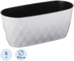 Горшок для цветов Idiland Laurel 5 л с внутренней вставкой 5 л белый (15×15.2 см)<br><br>Горшок линейки Laurel белого цвета объёмом 5 литров подходит для посадки нескольких растений. Он снабжён поддоном и системой прикорневого полива, что помогает поддерживать оптимальный уровень влаги для растений. Стильная и минималистичная рельефная фактура, напоминающая огранку драгоценного камня, а также спокойный базовый цвет позволяют гармонично вписать горшок в любой интерьер.<br><br>Горшок состоит из корпуса и интегрированного поддона, не выступающего за дно горшка. Вставка с дренажными отверстиями обеспечит отток лишней жидкости и качественную вентиляцию корней растений благодаря циркуляции воздуха между вставкой и внешним корпусом. Каждый поддон снабжён специальной выемкой для слива лишней жидкости, что помогает в уходе за растениями.<br><br>Горшок изготовлен из долговечного и экологичного полипропилена, который подлежит переработке. Он устойчив к перепадам температур и идеально подходит для использования как в помещении, так и на улице (в том числе для балконов, террас и дач). Габариты горшка составляют: высота — 15 см, ширина — 15.2 см, длина — 35.4 см. Вес — 342.5 грамма. Тип установки — настольный.