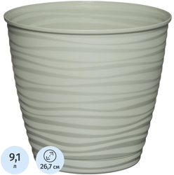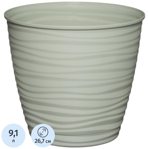 Горшок для цветов с поддоном Idiland Saffron 9.1 л светло-зелёный (24.5×26.7 см)<br><br>Горшок Saffron светло-зелёного цвета оптимален для больших растений. Он состоит из корпуса и интегрированного поддона, который не выступает за дно горшка. Горшок имеет несколько дренажных отверстий, обеспечивающих качественную вентиляцию корней растений, что способствует их правильному развитию. Поддон снабжён специальной выемкой для слива лишней жидкости, что важно для ухода за растениями.<br><br>Горшок выполнен в матовом исполнении с рельефными волнистыми стенками, что придает ему стильный и гармоничный внешний вид. Дизайн горшка вызывает ассоциации с песчаными барханами и шепотом моря. Изготавливается из долговечного перерабатываемого полипропилена, что обеспечивает его долговечность и устойчивость к внешним воздействиям.<br><br>Объём 9.1 литра. Размеры горшка: высота — 24.5 см, ширина — 26.7 см. Вес горшка — 296 грамм. Тип установки — напольный. Горшок отлично подойдет для рассады и выращивания цветов.