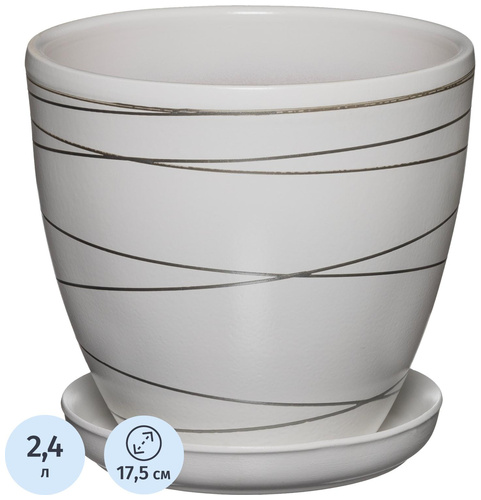 Горшок для цветов с поддоном Вещицы 2.4 л белый (16×18 см)<br><br>Керамический горшок белого цвета подойдёт для выращивания комнатных растений. Он выполнен из высококачественной глины и имеет классическую форму с оригинальным дизайном, что делает его подходящим для различных интерьерных решений. К горшку прилагается поддон, который поможет собирать лишнюю воду.<br><br>Объём горшка составляет 2.4 литра, а его размеры — 160 мм в высоту и 180 мм в ширину, с шириной основания 100 мм. Горшок оснащён дренажным отверстием для обеспечения хорошей циркуляции воздуха и предотвращения застоя воды.<br><br>Его можно использовать как для рассады, так и для уже выращенных цветов. Прочный и надёжный материал и эстетичный вид делают горшок отличным выбором для вашего дома или подарка.