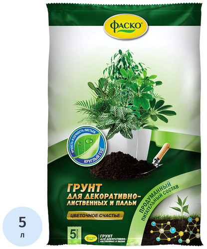 <p>Универсальный питательный грунт предназначенный при выращивании <nobr>декоративно-лиственных</nobr> культур. В нем содержатся питательные вещества и микроэлементы, необходимые для хорошего роста и нормального развития растений. Преимущества: — Профессиональный специализированный продукт; — Обеспечивает высокую декоративность и устойчивую окраску листьев; — Ускоряет рост и развитие растений. Состав: торф низинный, торф верховой, песок, доломитовая мука, комплексное минеральное удобрение с микроэлементами. Объем: 5 л. Вес: 2,2 кг.</p>