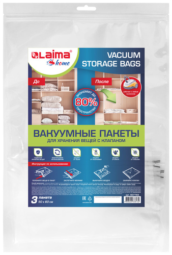 Вакуумные пакеты с клапаном для хранения вещей герметичны и водонепроницаемы, защищают вещи от воздействия пыли, влаги, плесени, бактерий и насекомых. Прозрачный материал позволит легко ориентироваться в содержимом и быстро найти нужную вещь. Пакеты изготовлены из высококачественных материалов, обладающих улучшенными эксплуатационными свойствами и имеющих высокую стойкость к повреждениям и проколам. Прочность и эластичность материала, конструкция замка с двойной молнией и клапан с крышкой позволяют использовать пакет многократно. В комплект входят 3 пакета размером 50х60 см. Размер упаковки - 29х44 см.