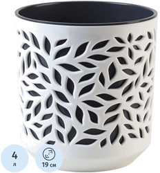 Кашпо La decoro Leaves 4 л с внутренней вставкой 3.6 л белый/антрацит (19.5×19 см)<br><br>Изысканная серия кашпо Leaves создана для любителей нежного и оригинального дизайна. <br>Кашпо создано с любовью к растениям и отлично впишется в уютный, атмосферный дом или квартиру. Благодаря наличию дренажной вставки с отверстиями, кашпо сохранит корневую систему растений здоровой и позволит ей дышать. <br>Представлено широкой линейкой литражей, позволяющих выдержать интерьер в едином стиле.<br><br>Цветовая палитра включает классический белый и современный серый, что позволяет выбрать вариант, идеально подходящий под любой интерьер и стиль.<br><br>Диаметр основания кашпо составляет 13.5 см.<br><br>Кашпо оформлено в стильную упаковку с амбассадором бренда La Decoro Юлией Высоцкой.