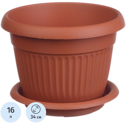 Кашпо с поддоном М-пластика Ливия 16 л терракотовый (27.5×37 см)<br><br>Кашпо предназначено для выращивания цветов и комнатных растений. Оно выполнено из полипропилена, что придаёт ему прочность и лёгкость. Кашпо имитирует внешний вид изделий из глины или мрамора, но при этом обладает преимуществами, такими как устойчивость к ультрафиолетовым лучам и перепадам температур.<br><br>Общий объём кашпо составляет 16 литров, его диаметр — 37 см, а высота — 27.5 см. Ширина основания равна 22 см, что придаёт кашпо хорошую устойчивость. В комплект входит поддон, который предотвращает загрязнение поверхности и помогает собирать лишнюю воду. Кашпо имеет дренажное отверстие для стока воды.<br><br>Цвет кашпо — коричневый, что придаёт ему стильный и натуральный вид, подходящий для любого интерьера. Оно также может стать отличным подарком для любителей комнатных растений.
