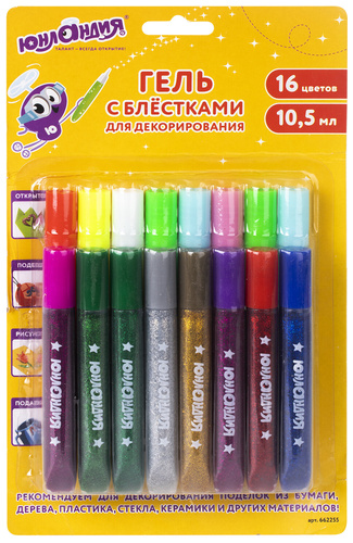 В наборе содержится 16 туб гель-клея с блёстками объёмом 10,5 мл 16 различных цветов. Разнообразие цветовой палитры даёт широкий простор для творчества!