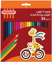 Набор состоит из 24 цветов: белый, бордовый, красный, алый, розовый, пурпурный, желтый, канареечный, оранжевый, салатовый, светло-зеленый, зеленый, темно-зеленый, голубой, синий, темно-синий, фиолетовый, темно-фиолетовый, светло-коричневый, коричневый, темно-коричневый, каштановый, серый, черный. Шестигранная форма сечения корпуса позволяет карандашу не скатываться с поверхности стола во время занятий рисованием. Карандаши изготовлены из пластика и имеют лакированный корпус, который при разломе не образует острые края и безопасен для детей. Легко затачиваются. Грифель диаметром 2,65 мм обладает повышенной прочностью. Все карандаши заточены и поставляются в картонной упаковке с европодвесом.