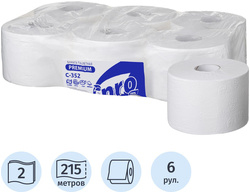 Бумага туалетная в рулонах Protissue <nobr>2-слойная</nobr> 6 рулонов по 215 метров (артикул производителя С352). <BR>Двухслойная туалетная бумага Protissue с центральной вытяжкой подойдет для использования в общественных туалетных зонах с высокой проходимостью, а также ответит повышенным требованиям комфорта и надежности. Благодаря растворению в воде удается свести к минимуму риск закупорки канализационных труб. Мягкая бумага высокой степени белизны производит хорошее впечатление на посетителей. <BR>Изготовлена из первичного сырья. <BR>Поставляется упаковками по 6 рулонов.