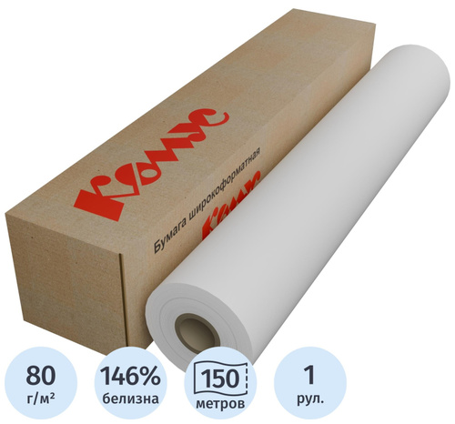Широкоформатная бумага Комус (ProMega engineer), предназначенная для печати технической документации, монохромных материалов ГИС и САПР, инженерной и деловой графики. Используется на широкоформатных ксерографических инженерных системах Xerox, KIP, Seiko, OCE, Riсoh, Kyocera Mitа. Бумажное полотно высокой степени белизны (146%), имеет формат A0 (841 мм). Оптимальная плотность, составляющая 80 г/кв.м, исключает просвечивание изображения. Бумага поставляется в рулонах по 150 м, упакованных в картонную коробку. Рекомендована ведущими производителями печатающей техники.<br> В рамках ребрендинга производится перевод данного артикула из ТМ Promega в ТМ Комус с сохранением всех потребительских характеристик товара. На переходный период допускается поставка данной продукции в двух вариантах дизайна.