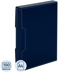 Удобная и практичная файловая папка формата А4 изготовлена из жесткого полипропилена синего цвета толщиной 1 мм. Имеет 100 несъемных прозрачных вкладышей, в каждый из которых можно вложить до двух листов. Подходит для хранения и демонстрации документов на презентациях, совещаниях, создания портфолио. Папка с файлами вложена в пластиковый бокс, который позволяет ставить ее на стол. В боксе предусмотрены выемки для легкого извлечения папки. Оба предмета декорированы окантовкой в виде прострочки. Плотность файлов 35 мкм.