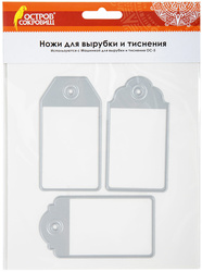 В набор входит 3 стальных ножа в форме фигурных бирок, размером 109х148 мм. Ножи многофункциональны: каждый из них позволяет создать вырубку и эффект тиснения. Материалы, подходящие для работы - бумага, картон, алюминиевая фольга для рукоделия, фоамиран и другие.