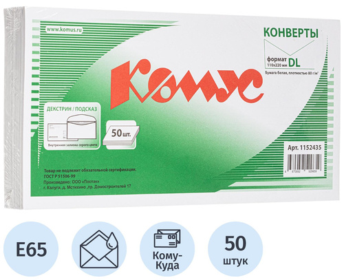 | 208-350 | С65 (110×220 мм),белые, "Куда-Кому", 80г/м², клапан автомат, 50шт/уп | упак |
