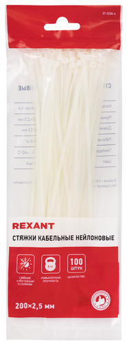 | 156-100 | нейлоновые, 2,5 мм х 200 мм, комплект 100 шт., REXANT, белые, европодвес | упак |